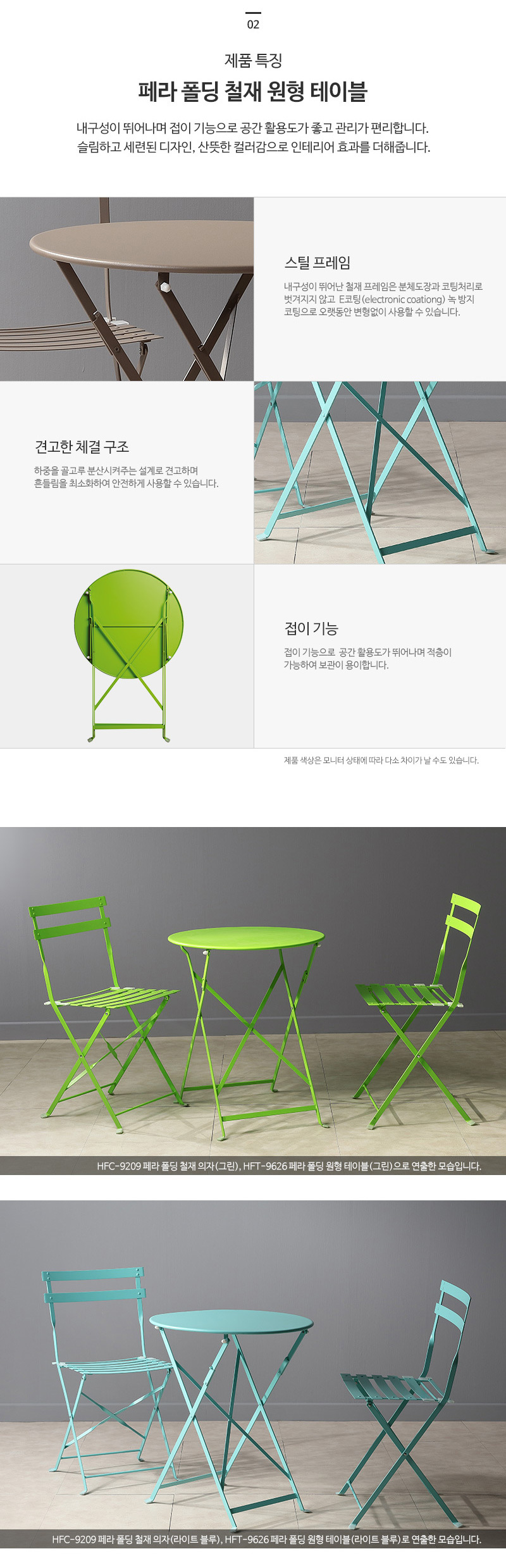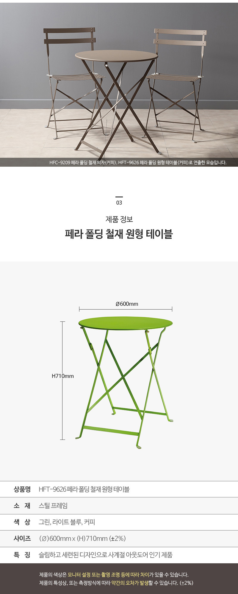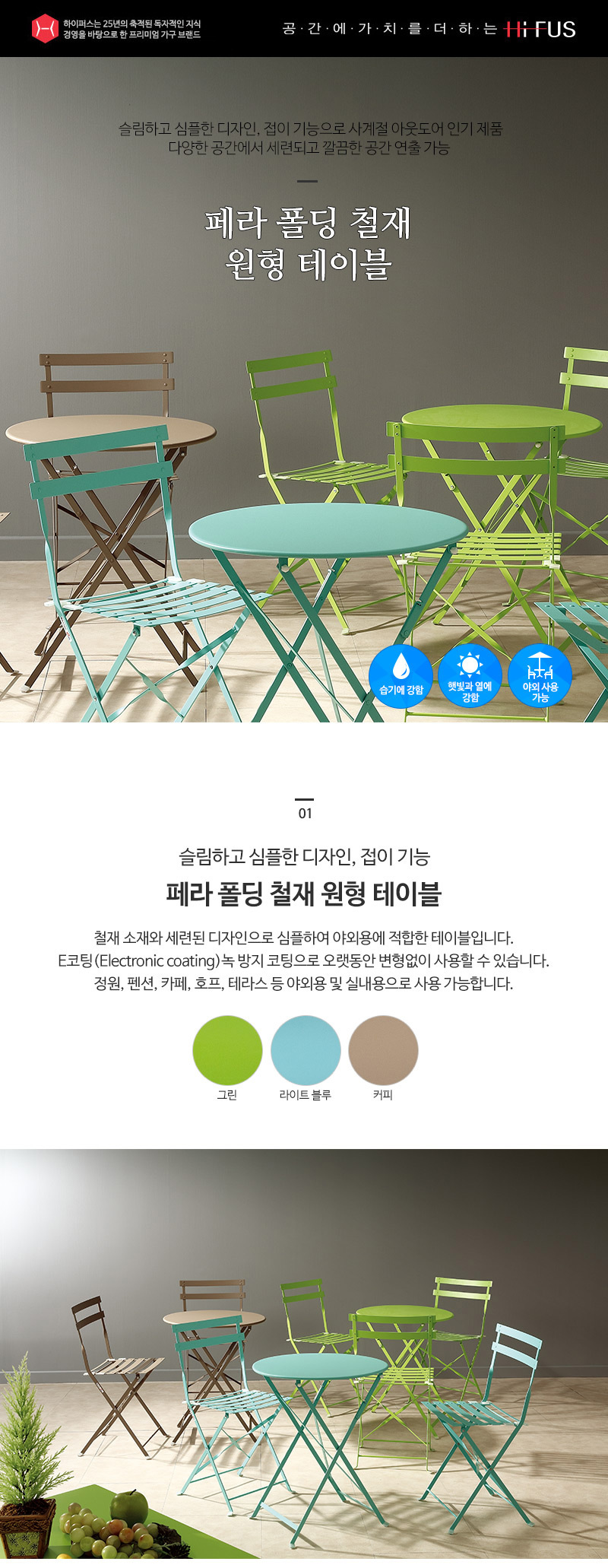 이미지 확대보기심플디자인 접이기능 사계절 아웃도어인기 카페 펜션 테라스 정원용 철재 원형테이블