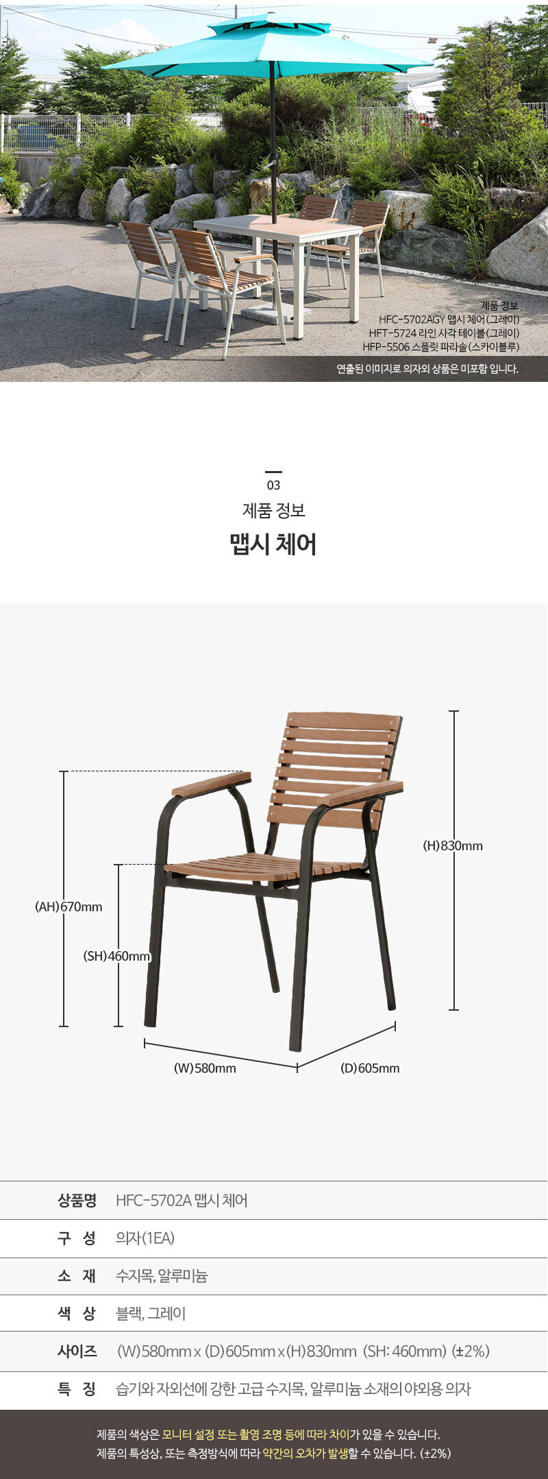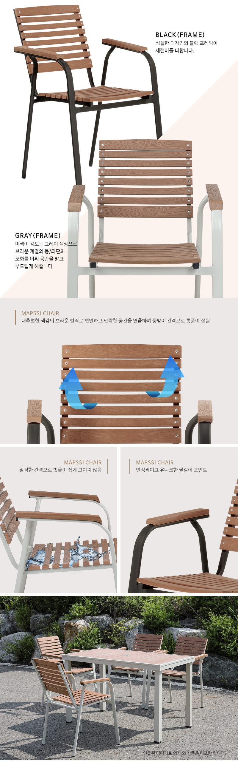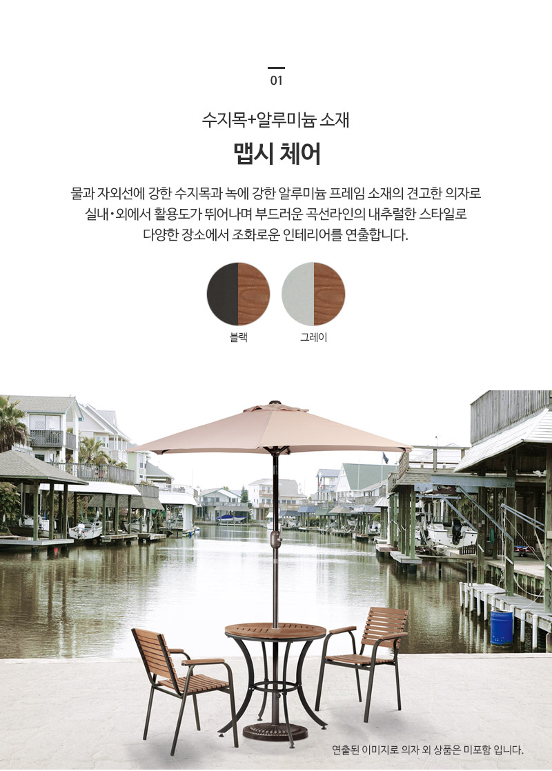 이미지 확대보기해변가 휴양지 펜션 카페 정원 적측가능 수지목 알미늄프레임 블랙 그레이 야외의자