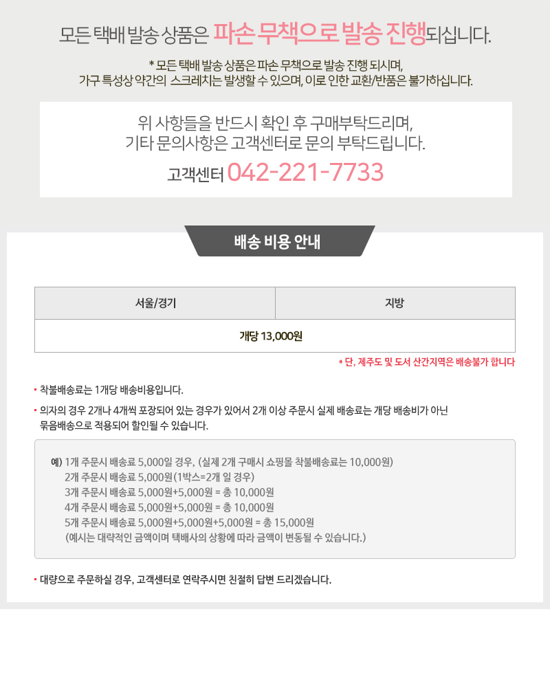 ※ 가구는 제품의 무게와 부피로 배송료가 부과되며, 제품마다 발송물류센터가 다르므로 묶음배송이 불가하십니다.